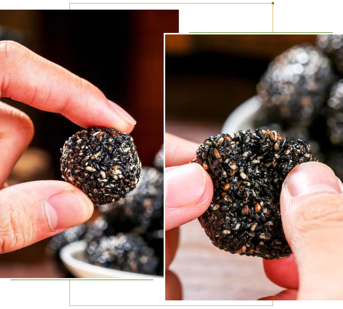 黑芝麻在九次蒸晒后,芝麻壳自然脱落,仁体金黄,香气四溢;黄精经九制后更为平和,刺激性物质被悉数去除,质地变得油润软糯,口感甘甜,两者结合相互衬托,相得益彰,令人回味无穷。